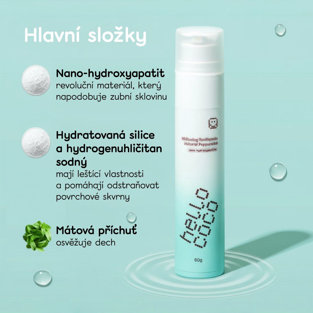 Nano-hydroxyapatit (n-Ha) – revoluční pokrok v zubní péči. Hydroxyapatit je hlavní složkou zubů a kostí, která pomáhá remineralizovat oslabenou sklovinu a snižuje citlivost zubů. Zároveň vyhlazuje povrch zubů, díky čemuž vypadají přirozeně bělejší.